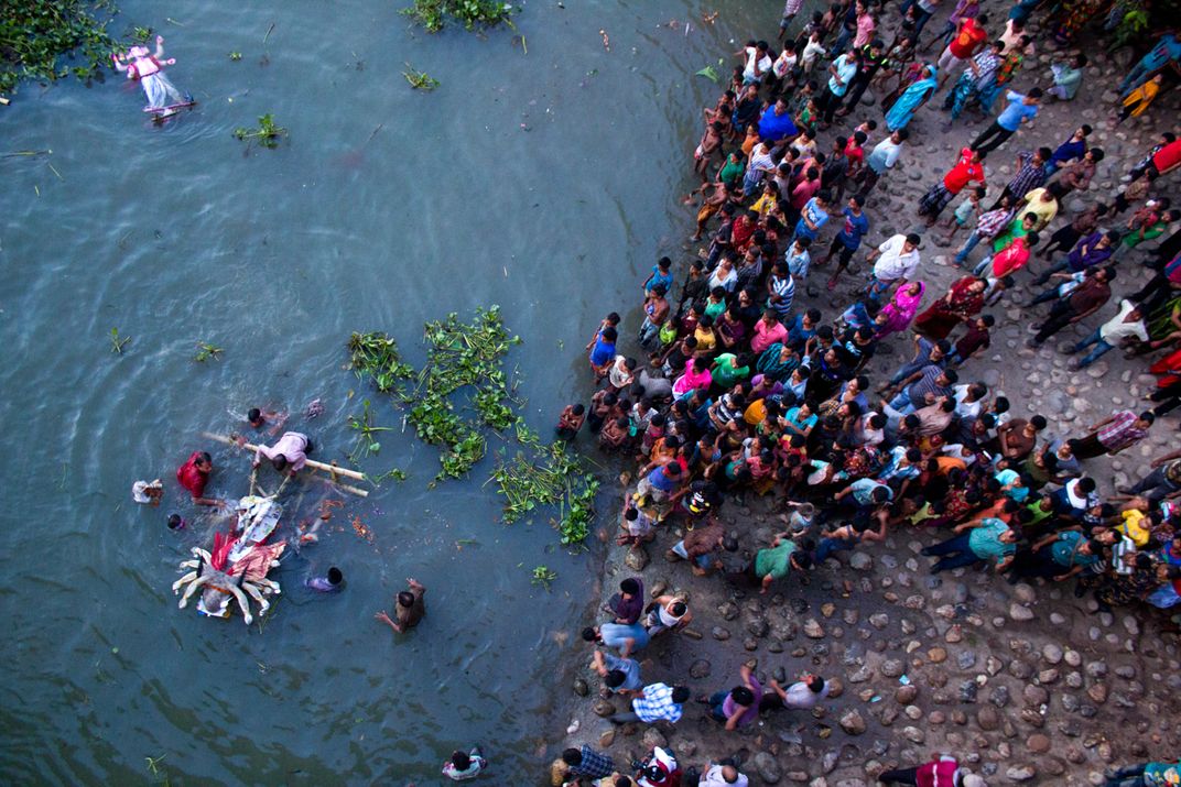 After the 10 day ceremonial worship of the mother goddess "Durga" meaning the invincible Goddess. The farewell is executed by immersing The goddess in deep water hoping that next year she will return reincarnated among the Hindus with blessings.