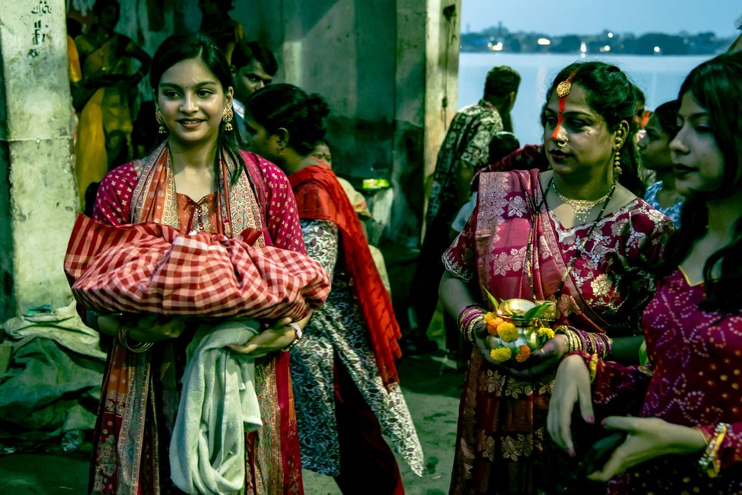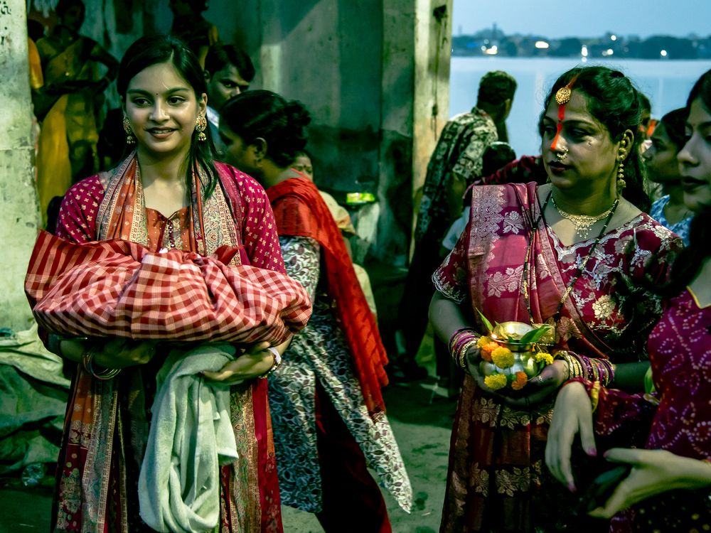 Devotees, wrapped in festive attire, head home after Chhath rituals. Their serene expressions and sacred items reflect devotion, tradition, and the peaceful close of a spiritually rich evening.