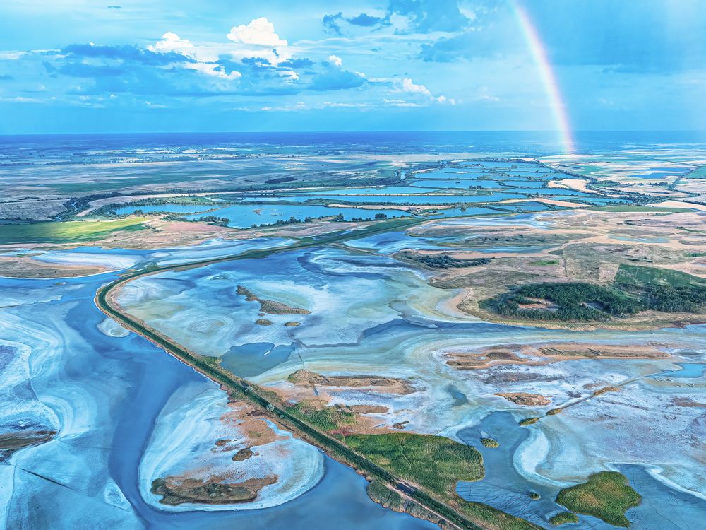 This special aerial shot was taken just after a heavy summer rain, showing a parched saline landscape that has finally received some rainfall after a long time. The colorful water spots appearing on the surface carry the promise of nature’s revival. The composition is made even more magical by the rainbow appearing in the background, which seems to symbolize the renewal of the landscape, a gift of a rare, lucky moment.