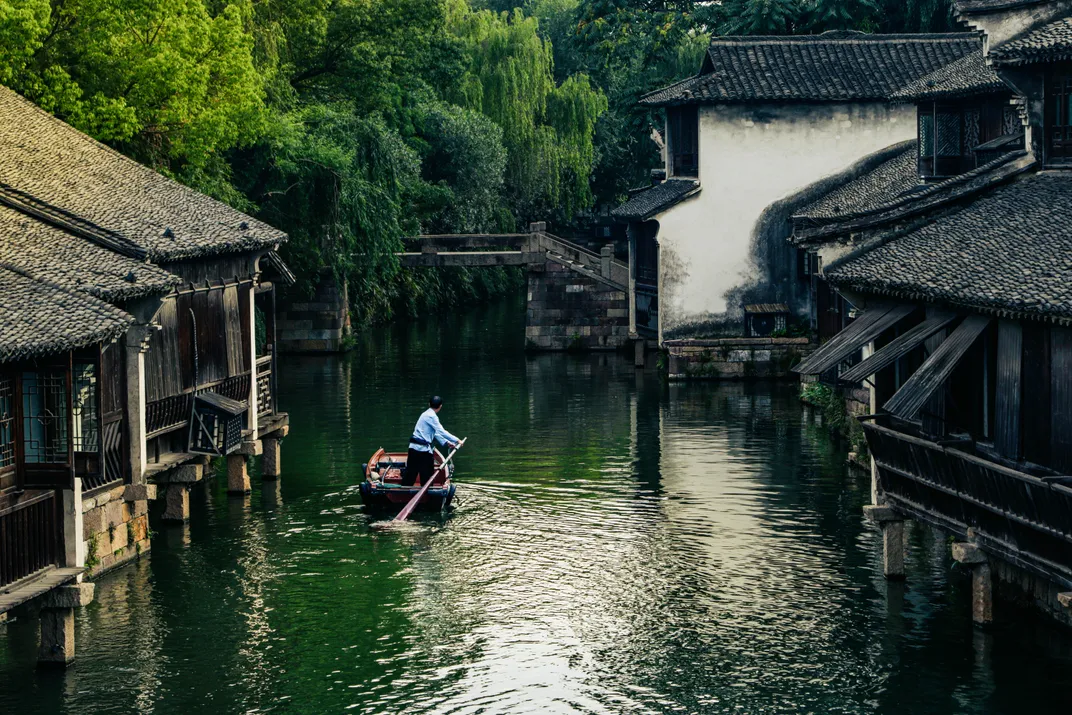 In Wuzhen, China, in the afternoon, a boatman moves slowly down a calm river. This peaceful scene, surrounded by old wooden buildings and lots of greenery, shows how beautiful and peaceful this ancient water town has always been.