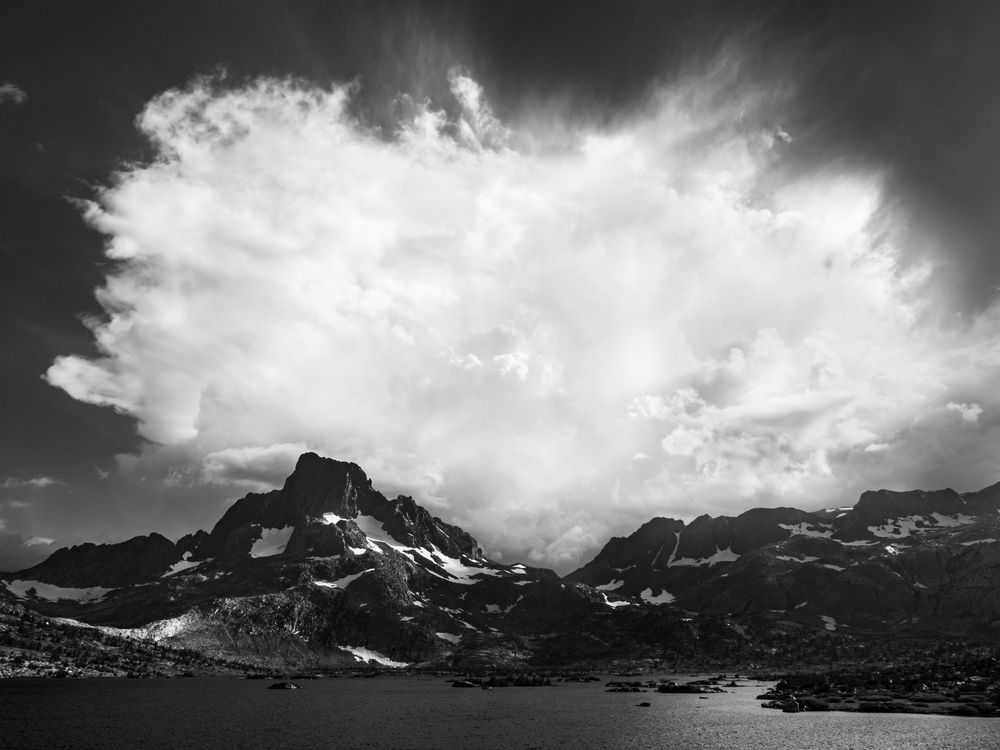 This is a photograph of afternoon thunderstorms forming on a summer day over top Banner Peak and the Ritter Range in Inyo National Forest.
