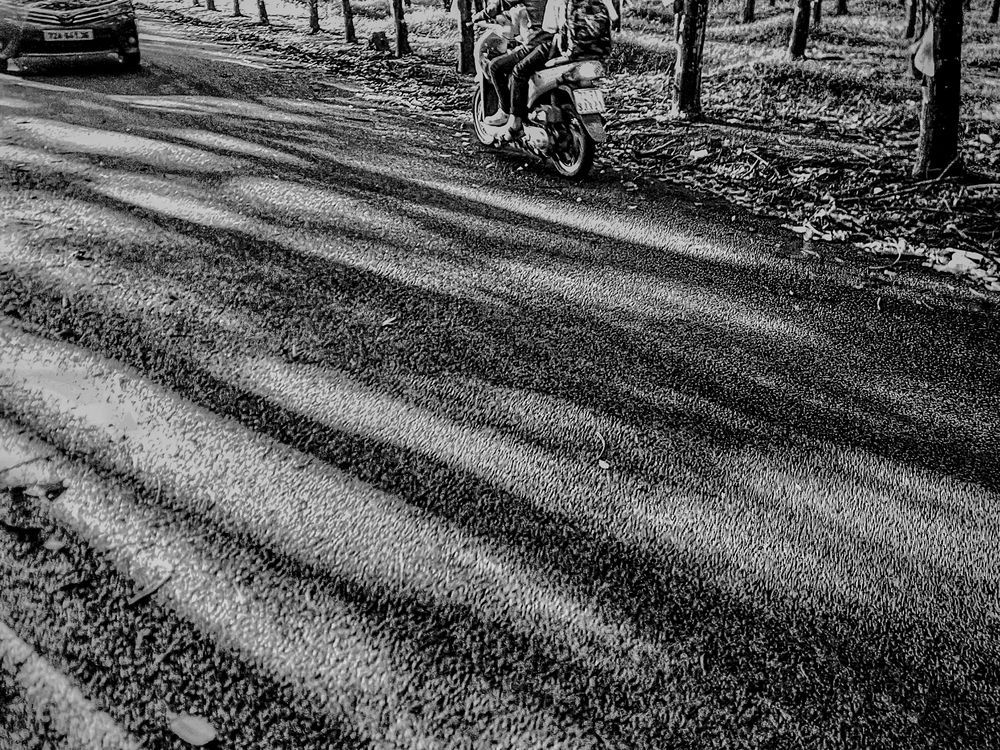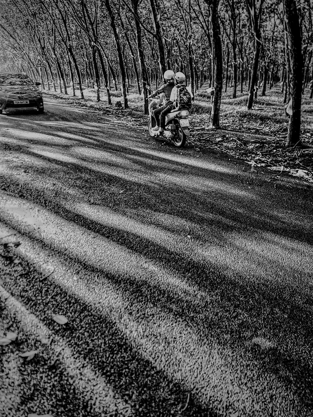 Two students ride home on a rural road, bathed in the last subeam of the late afternoon .