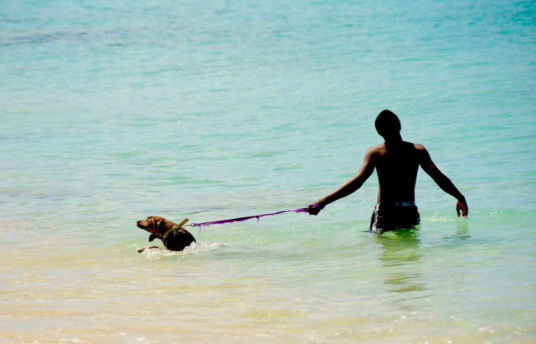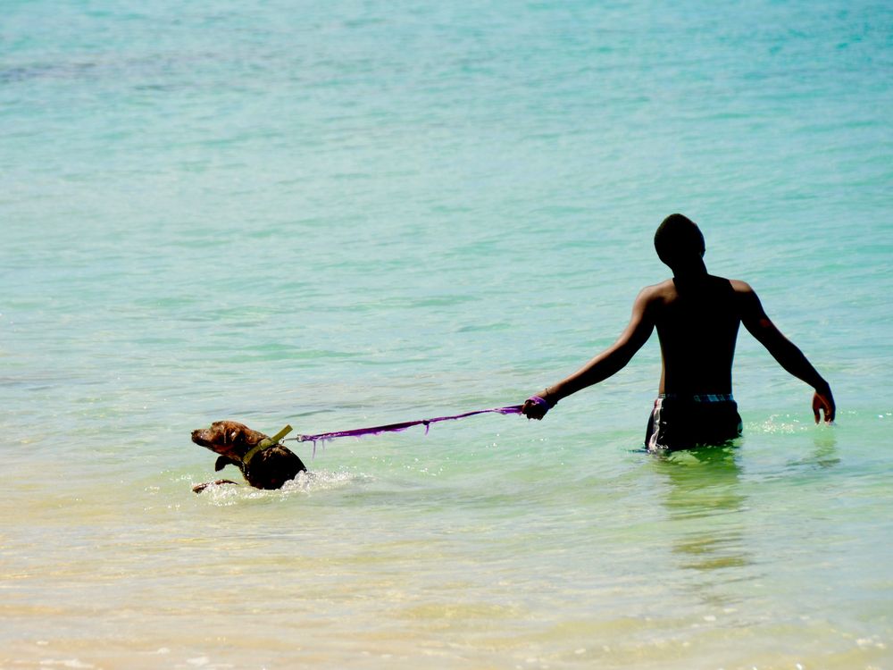 A young man takes his dog for a much needed dip in the cooling waters of Paynes Bay, Barbados