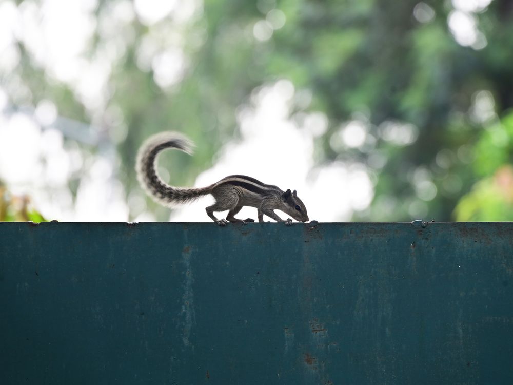 An alert Indian Palm Squirrel pauses momentarily on a rooftop ledge. Shot with a wide aperture to achieve beautiful bokeh, isolating the sharp subject and emphasizing the motion blur in its distinctive, curved tail against the bright, natural background.