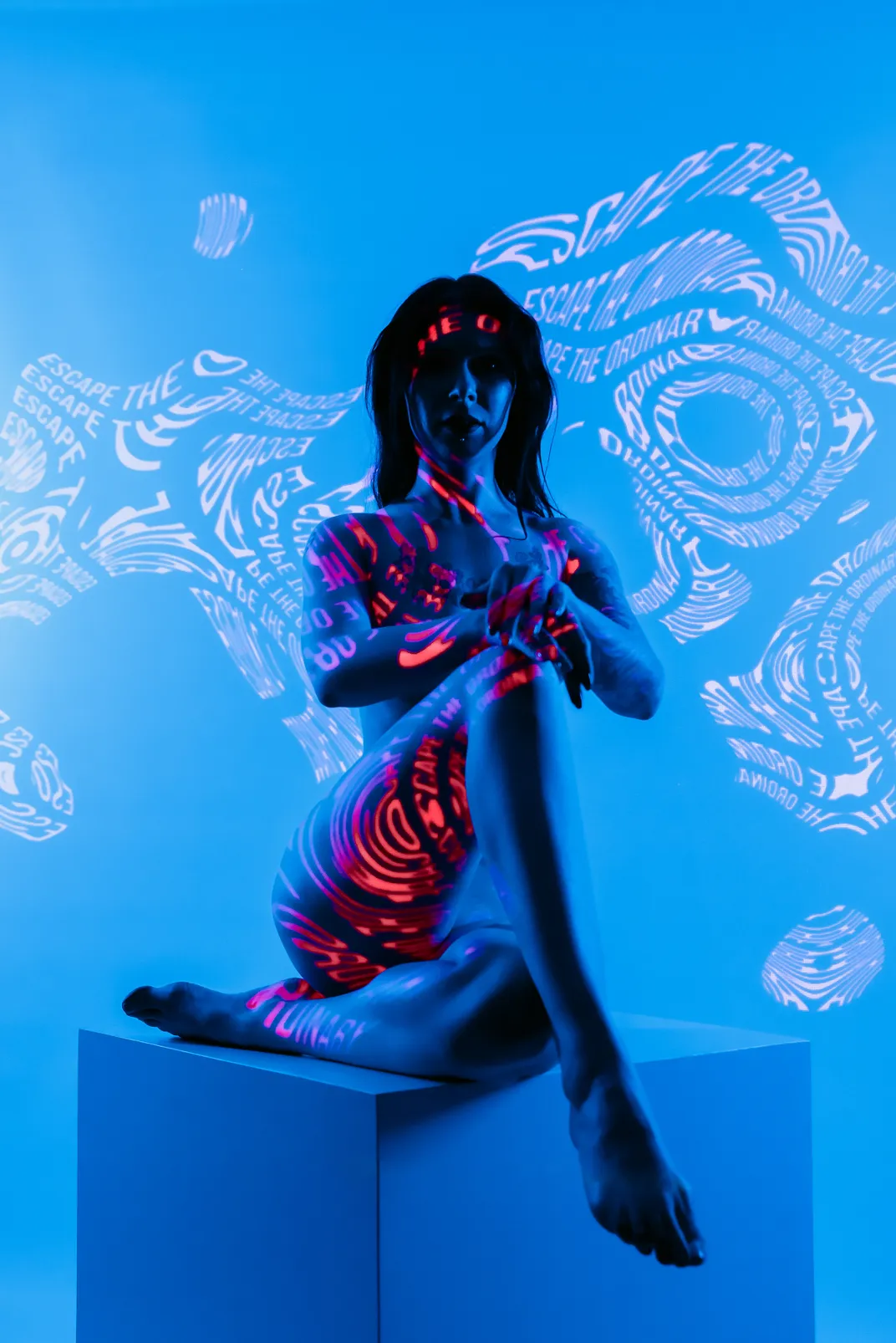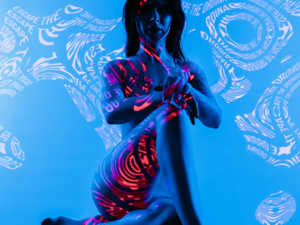 A woman is facing the viewer, boldly embodying the fusion of human and AI. In this blend of human body and neon lights like digital patterns, what will prevail?