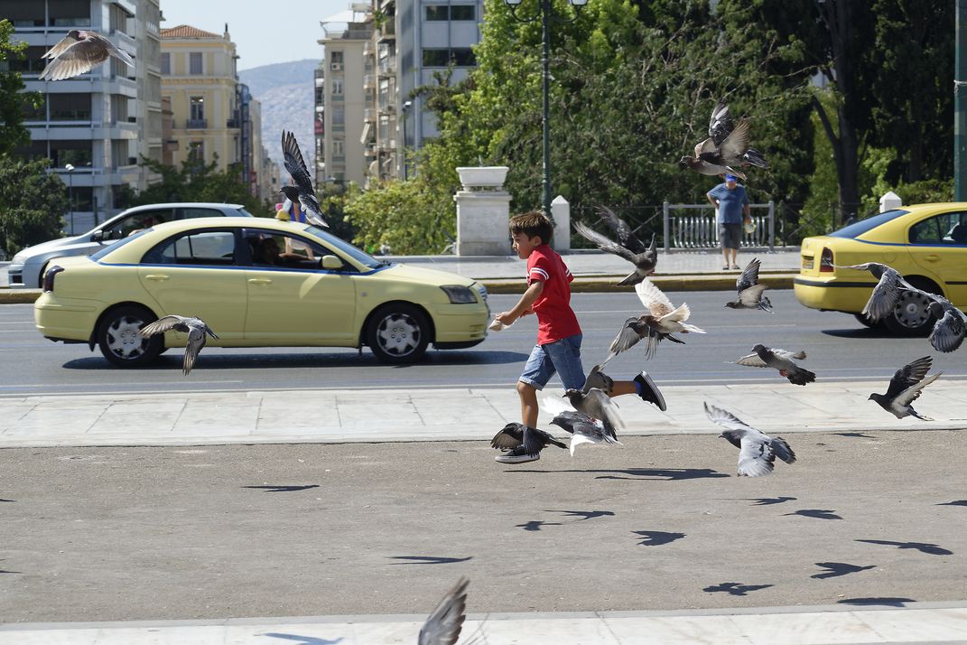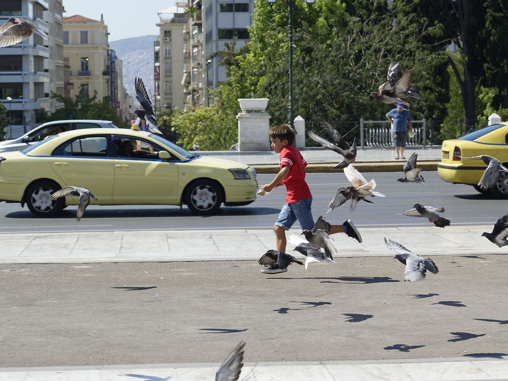 A boy fed the birds and they wanted more. They chased after him. I caught him mid-air as he was running away.
