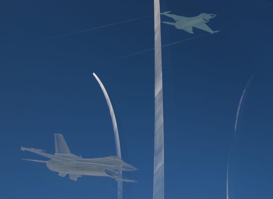 Air Force Memorial Reflected on Etched Glass Panel of Missing Man Formation
