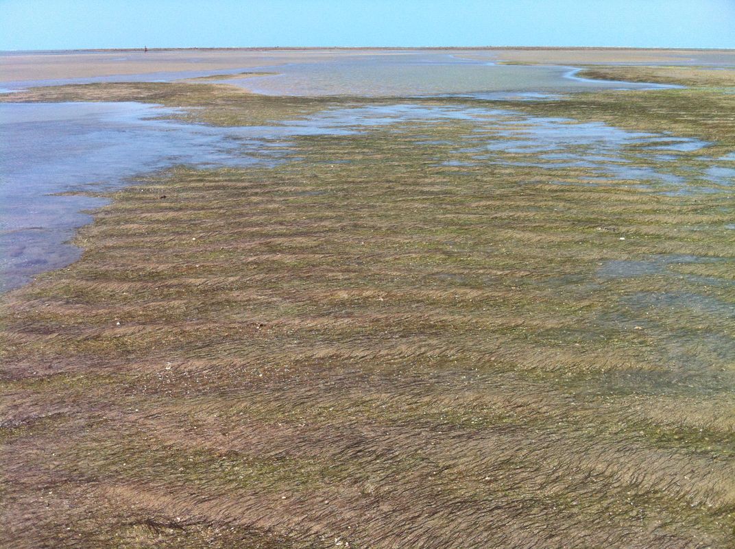 In this beach in the Brazilian coast, when the tide is low one can walk far away from the beach into the ocean with the waterline as high as your ankles, passing by deeper pools or algae fields like this.