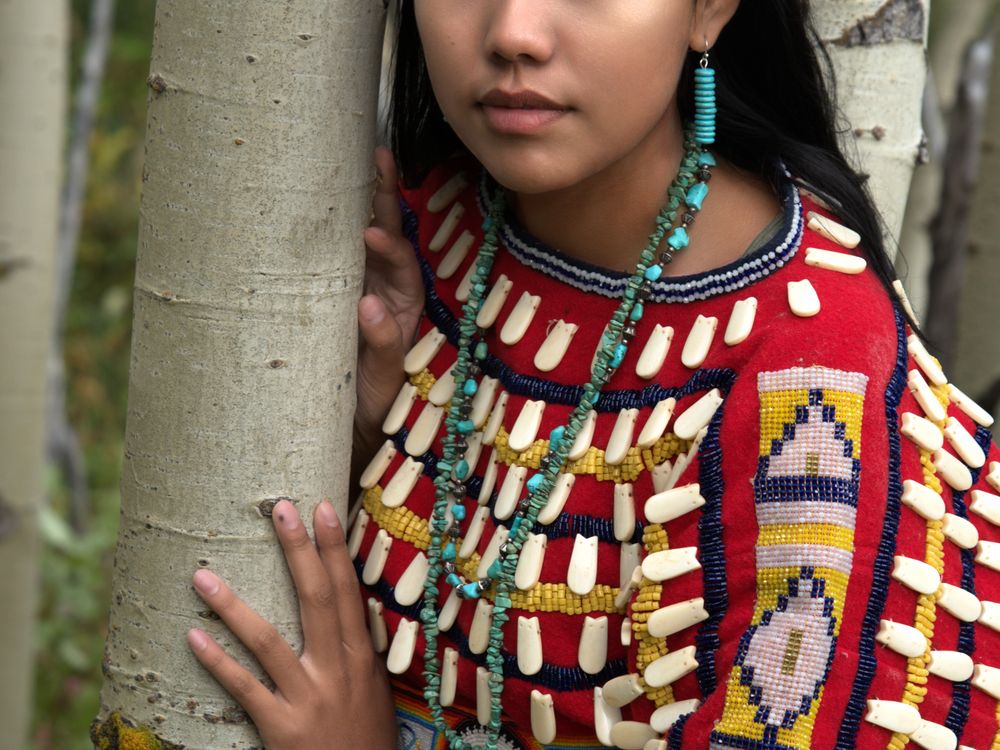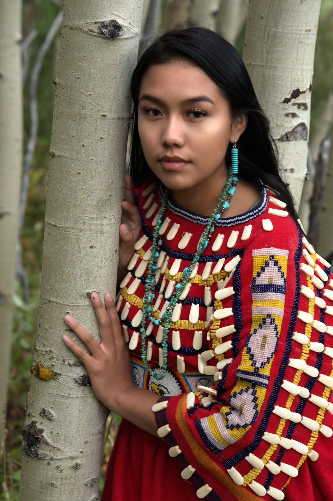 In traditional regalia called the "Elk Dress" eight generations old.
