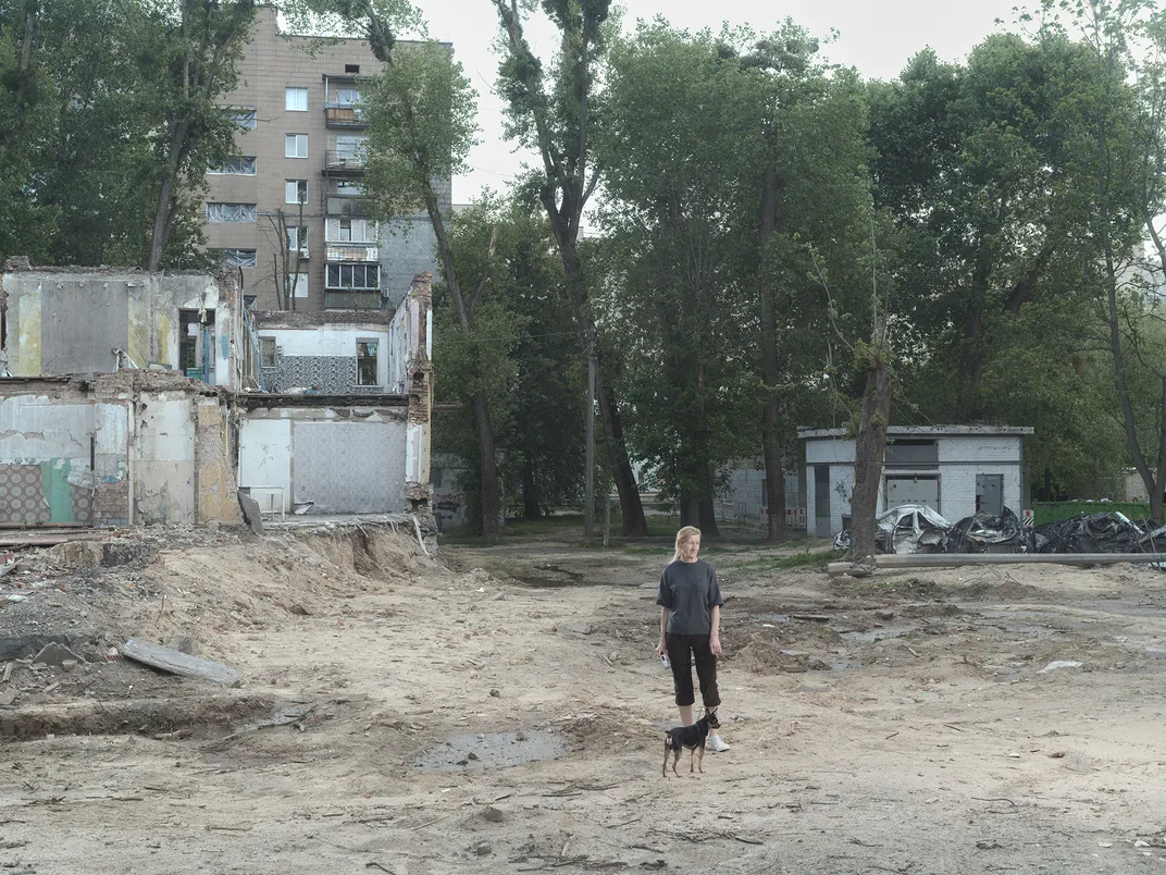 I met Alina by chance one morning, as I was photographing the remains of a shattered building for my project “Through the Cracks Within Us, light penetrates.” She was walking her dog slowly, among the ruins and scattered debris — the silent remnants of an attack that took place in April 2024. Around her, daily life persisted, fragile yet unyielding. Here in Ukraine, people learn to live among broken stones, wounded landscapes, walls opened like wounds.