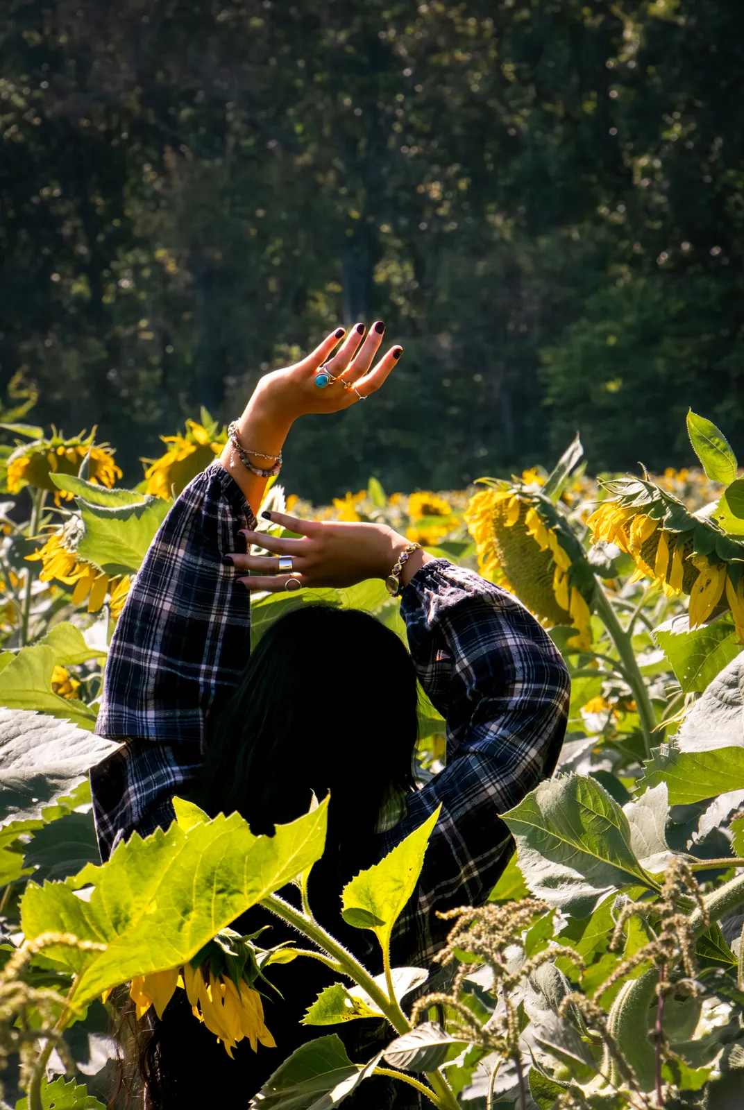 A girl stands amongst sunflowers.