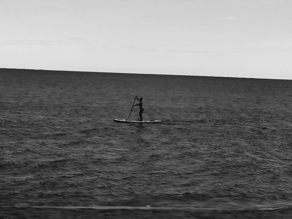 A single paddle boarder glides across the quiet sea, suspended between sky and water. The black-and-white tones strip away distractions, leaving only movement and silence. This image captures the fragile balance between isolation and peace — a moment of connection with nature in its simplest form.