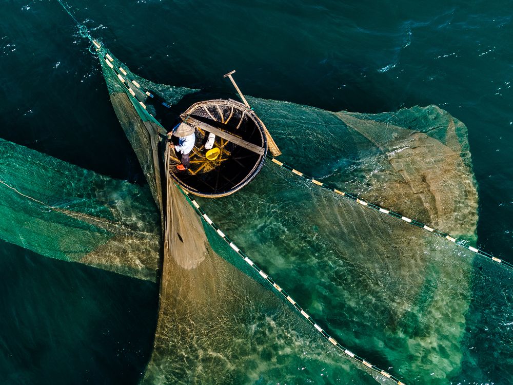 Alone in the middle of the sea. This is a fisherman at Chan May beach, Hue, Vietnam pulling a net to catch fish. The blue sea water in the landscape is so peaceful. I took this picture when I once passed through Hue.