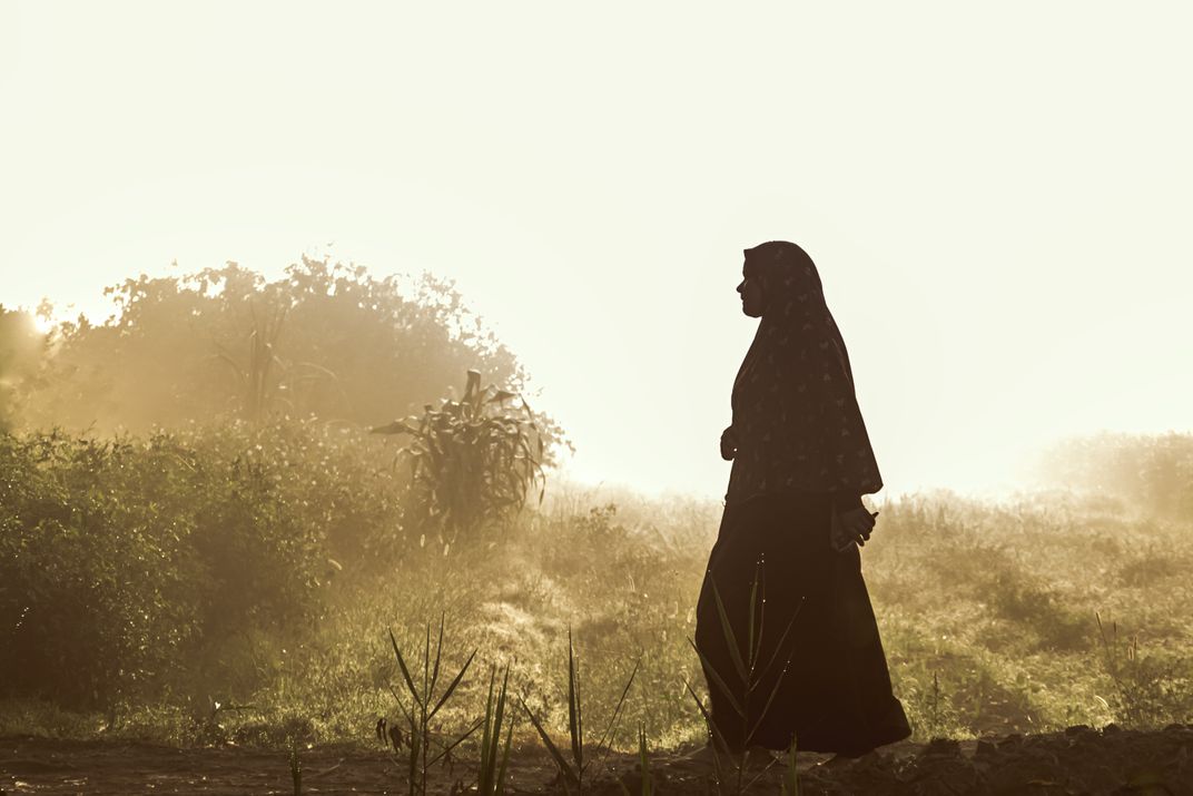 A photograph of a rural woman walking amidst the crops in the early morning after sunrise, facing the sun, creating a silhouette with the orange sunlight, giving the image a unique character.