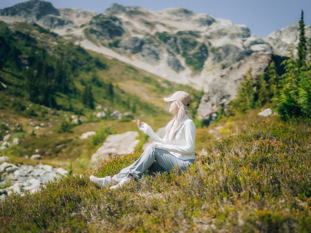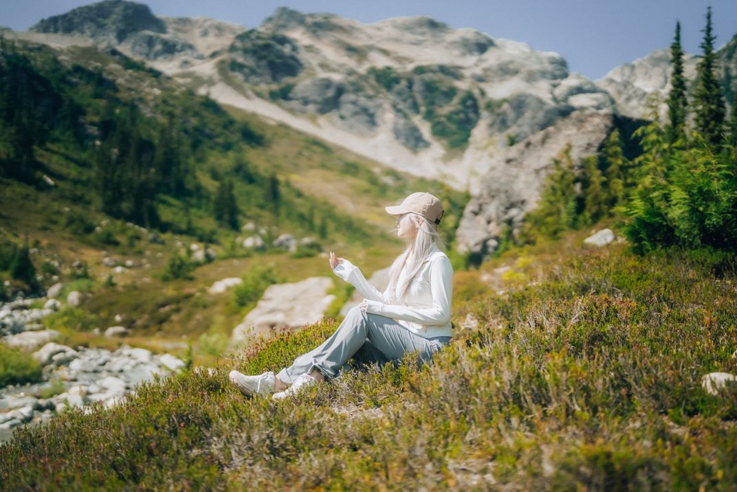 Seated on a mossy knoll, she pauses mid-trail as ridgelines drift into soft focus—an easy, breath-slow moment where mountain light and quiet do the talking.