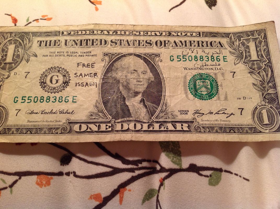 Altered dollar bill, with Arabic words saying "Freedom Now, Palestine" with reference to the hunger striker Samer Issawi.