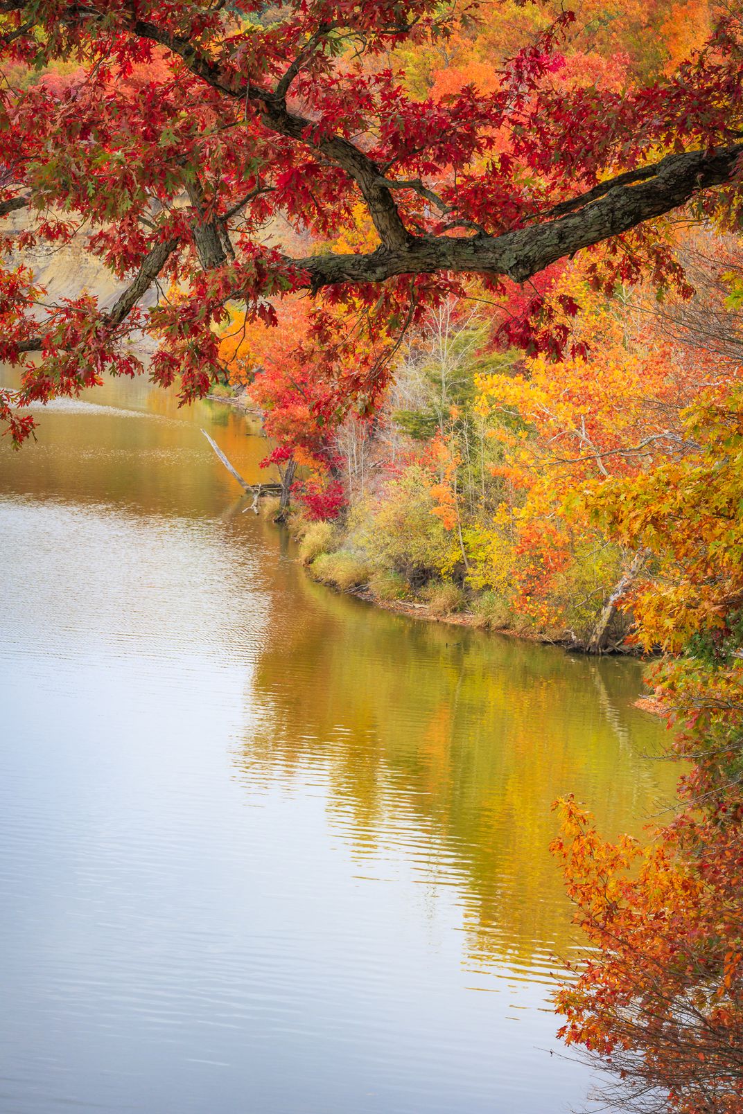 Layers of late autumn foliage colors paint quiet shoreline cove at Alum Creek State Park on a calm October morning.