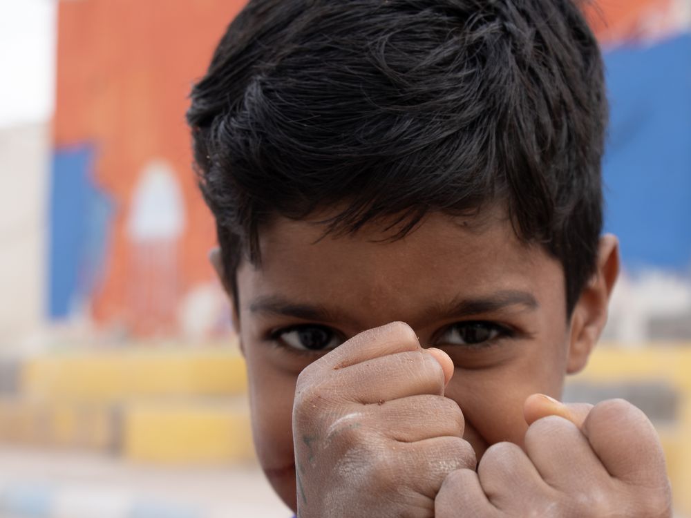 A child playing with his friend, laughing non-stop and running around. The heat didn't bother him. When I tried to take his picture, he would be mischievous and have his own gestures. His eyes were full of childish enthusiasm and none of the fuss of adults in his heart.