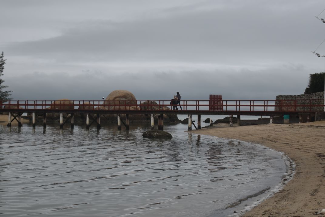 Praia em dia nublado com casal caminhando em uma ponte, apreciando momentos juntos.
