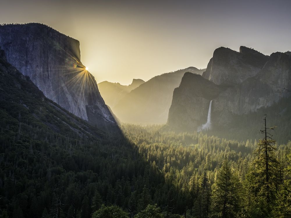 Sunrise at Tunnel View in Yosemite, NP. Made famous by Ansel Adams, catching the sunrise at Tunnel View is about as American as it gets in Yosemite National Park. The crowds arrive early (before 4 AM) to catch a spot along the wall. For at least ten minutes there is silence as the sun rises and sweeps across the valley. The only sound comes from fingers on the shutters.