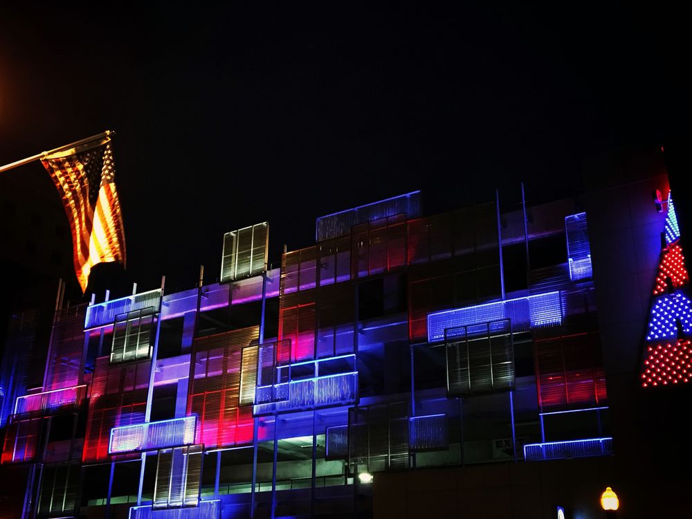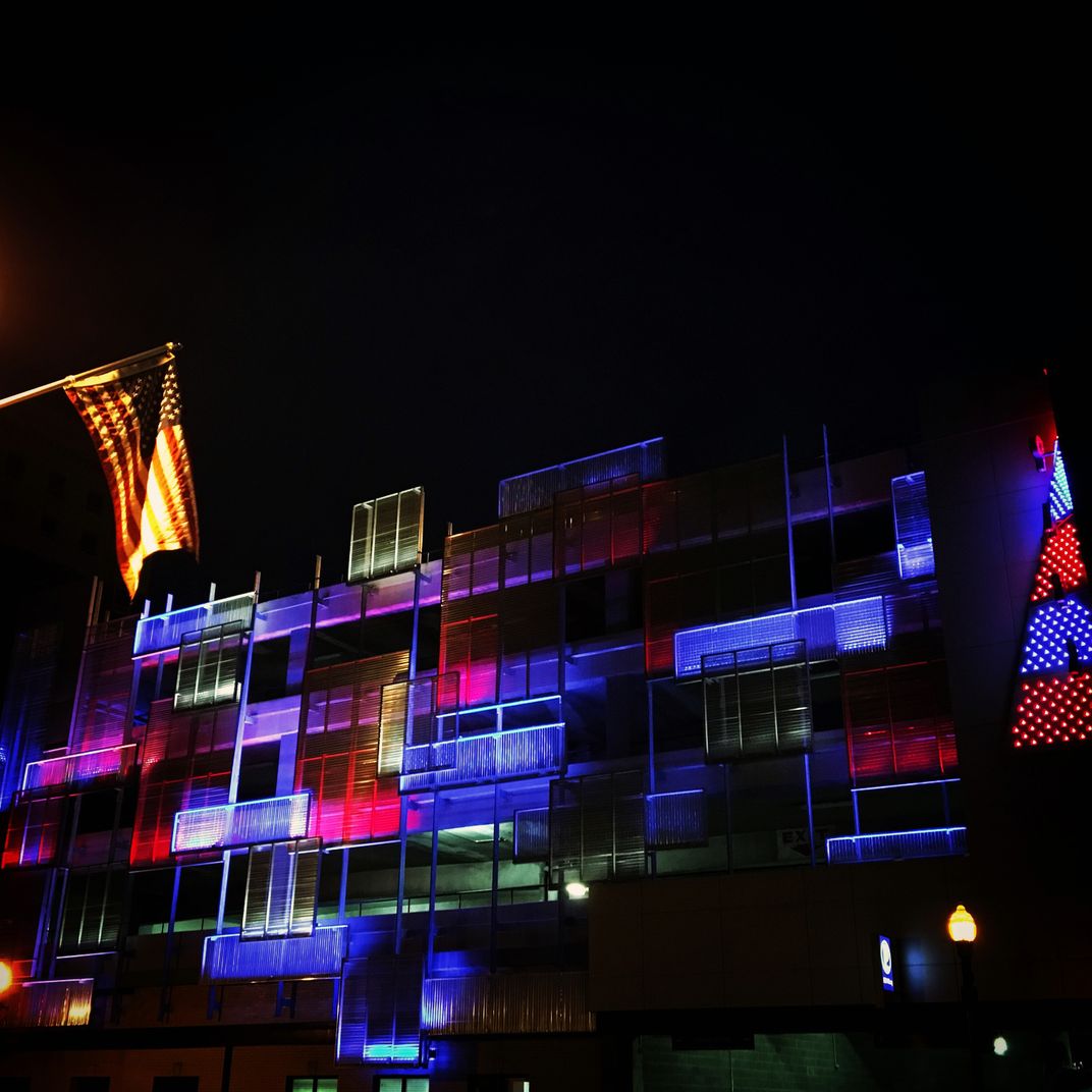 My hometown has a parking garage that they light up with different colors depending on the time of year or for various events. The town was decked out for a recent 4th of July parade.
