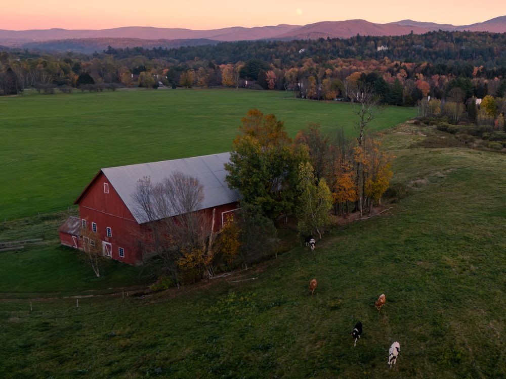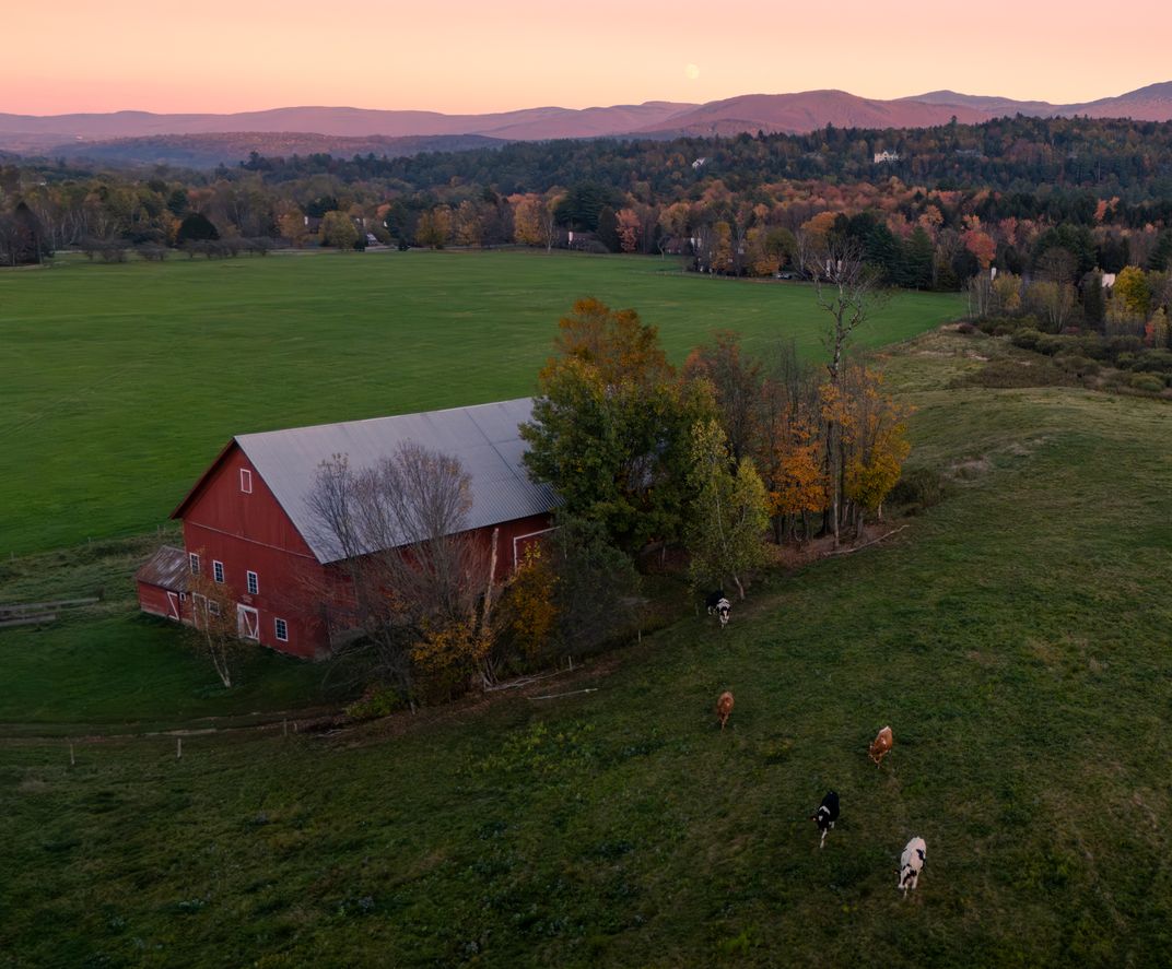 This image shows an American farm at working mode since the cows were healthy. The fall color and green grass as well as the red barn were more vibrant by the sunlight from sunset and moonrise.