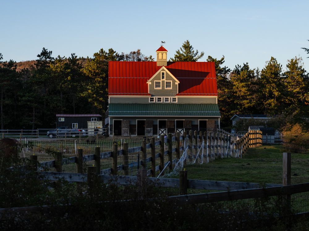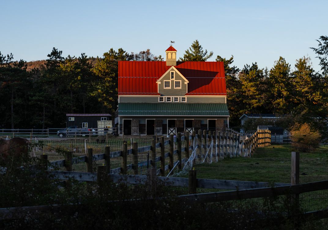 This image shows the American farm which has livestocks, fences, truck and barns. It was active. The sunlight really reveals the atmosphere of the vibrant active farm.