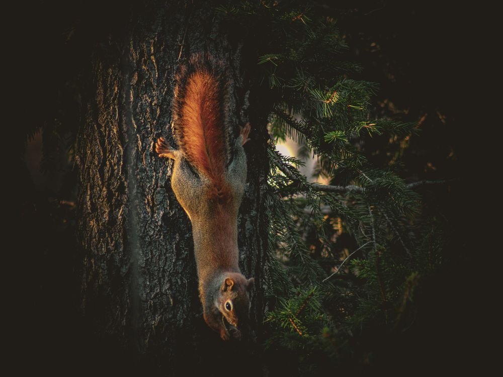 American Red Squirrel climbing down a tree.