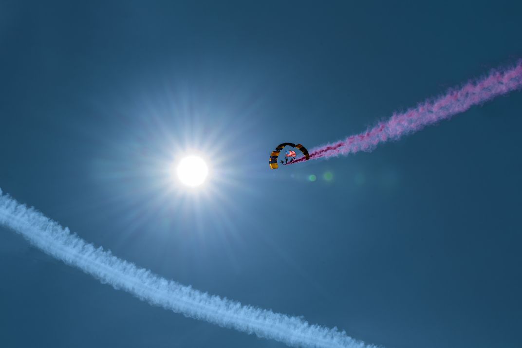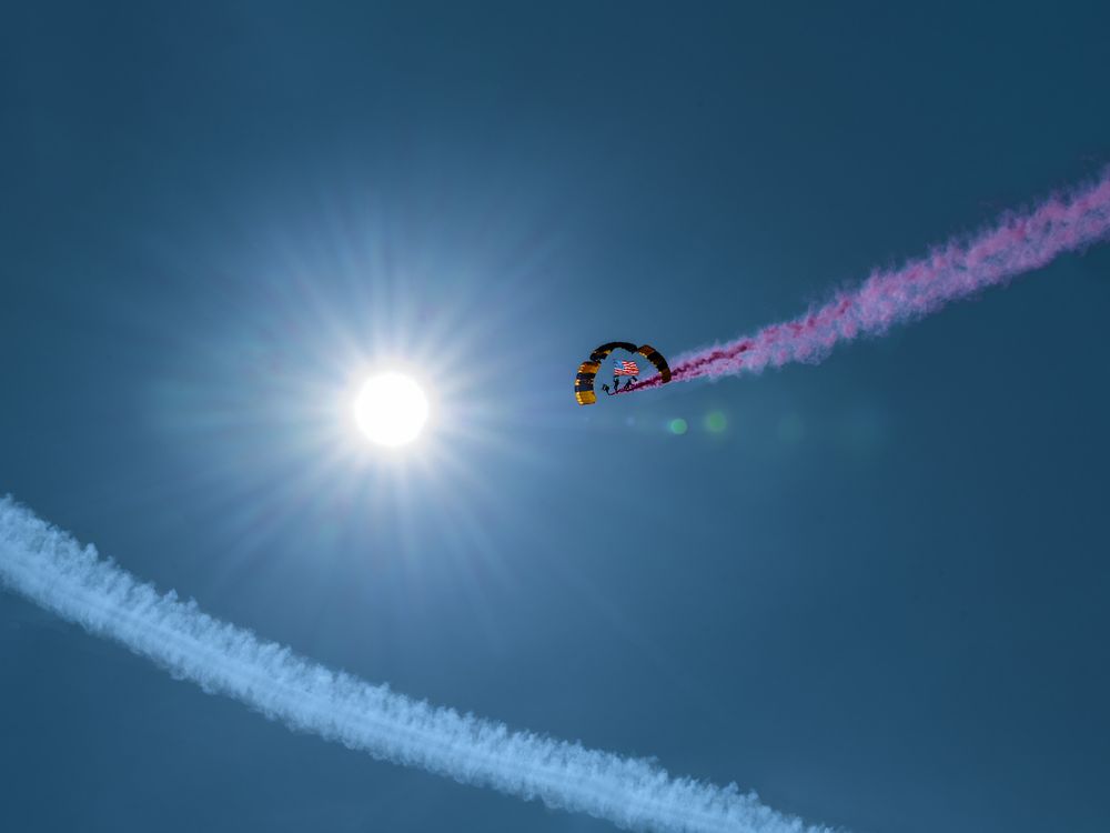 The photo was taken in the annual Air Show held at Jones Beach in Long Island. Three pilots were jumping out of the plane. They were flying in the air with their parachutes open and the American flag fluttering in the sky.