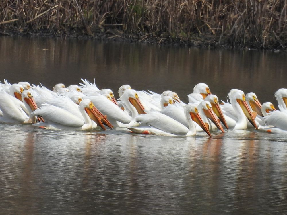 White pelicans spend 2-3 weeks in southern Wisconsin before heading further north to their breeding grounds. There are many very large groups.