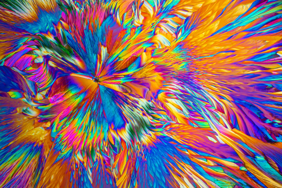 Crystals of amino acids forming abstract pattern when heated and dried onto a microscope slide and viewwed with a polarizing light microscope.
