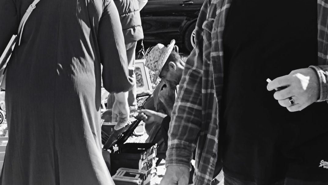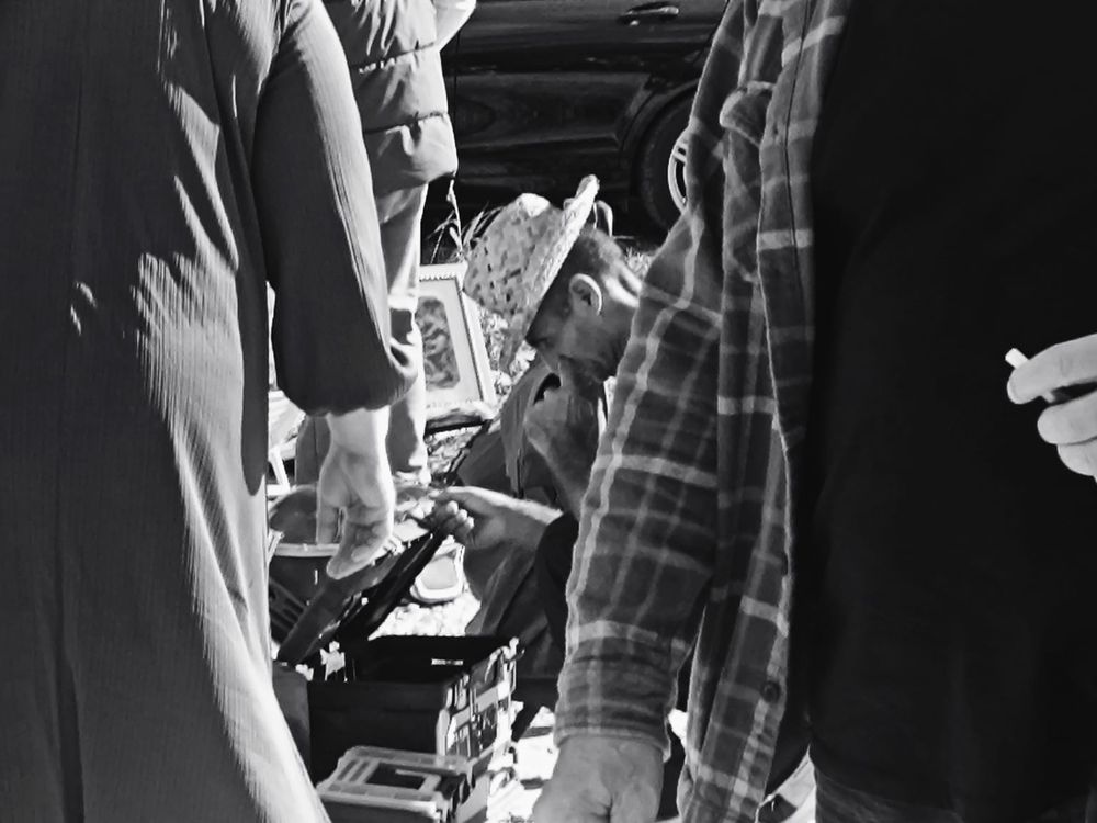 Amid the flow of people at a local flea market, one man pauses to look through old objects — forgotten fragments of other lives. The black-and-white tones emphasize the contrast between movement and stillness, between those who rush past and the one who stops to remember.