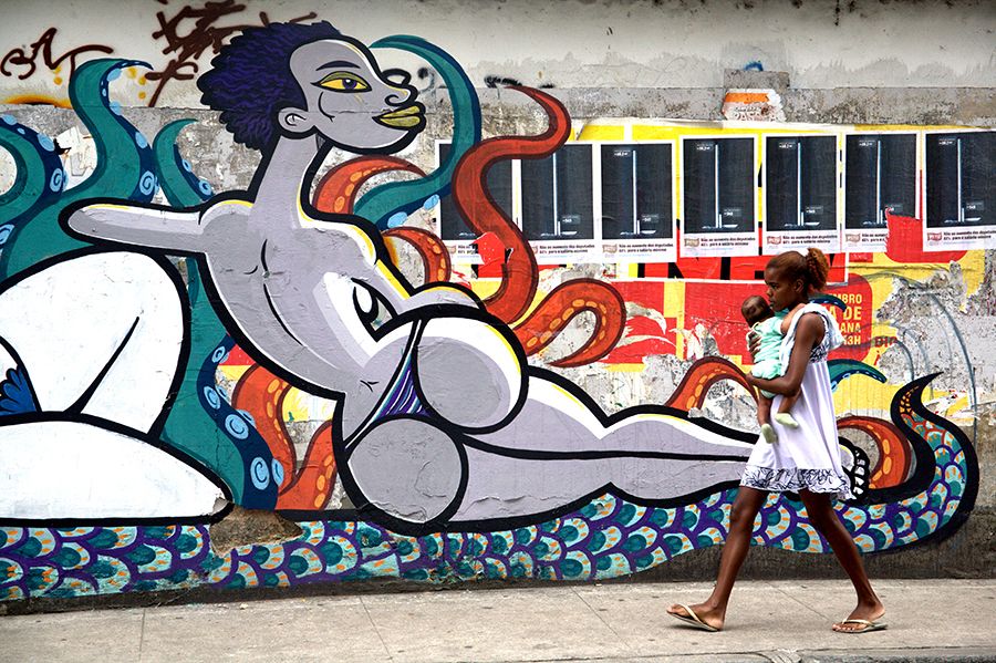 An adolescent girl and her child walk the streets of the Rocinha, one of Rio de Janeiro's largest, most densely populated and urbanized slums. In the decaying favelas of Rio, mother can be the only p