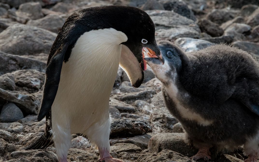 Paulet Island, at the north end of the Antarctic Peninsula, is one of the largest Adelie penguin colonies in Antarctica. After catching and storing krill in its stomach, this adult Adelie penguin returned to the colony, reunited with its chick and regurgitated this krill bundle to help appease a voracious appetite.