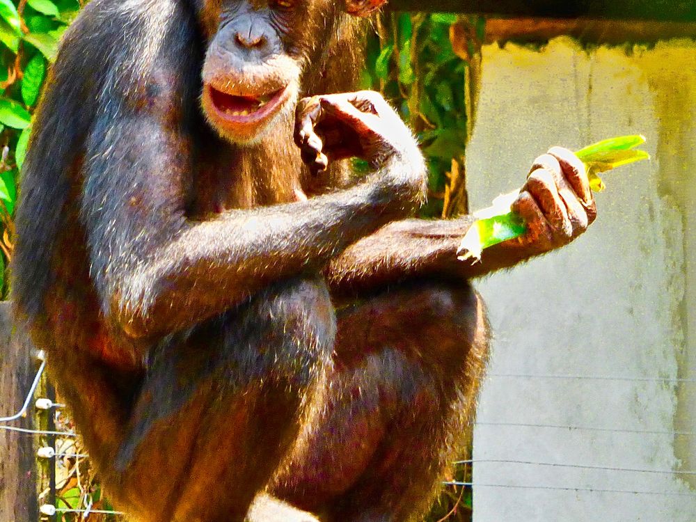 My tour bus driver took me to the Tacugama Chimpanzee Sanctuary to visit chimps that had been traumatized or orphaned. This adult chimp watched over a young chimp as it walked the tightrope without hanging on. I liked to believe that this was truly a smile for the little one's game of Look Ma, No Hands!