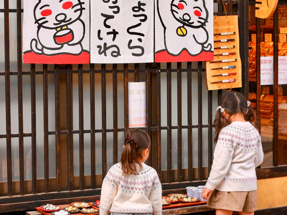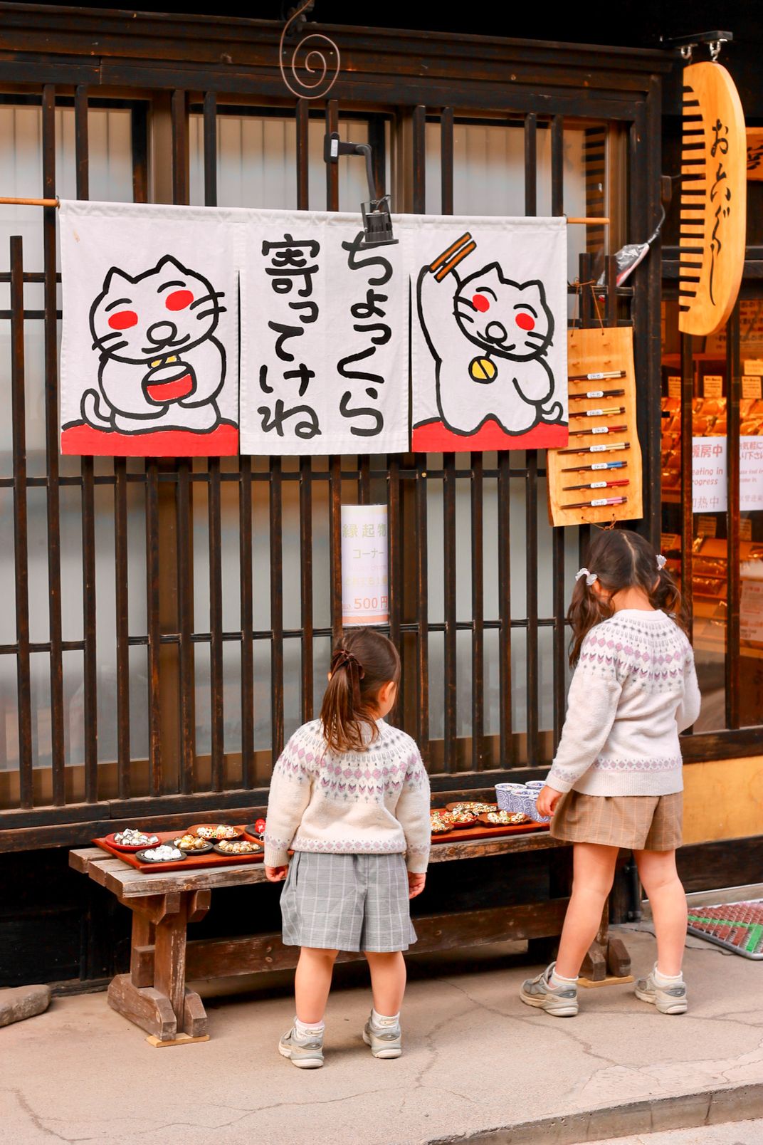 Two girls in matching sweaters eyeing a food display outside a restaurant and barber shop in Narai, Japan.