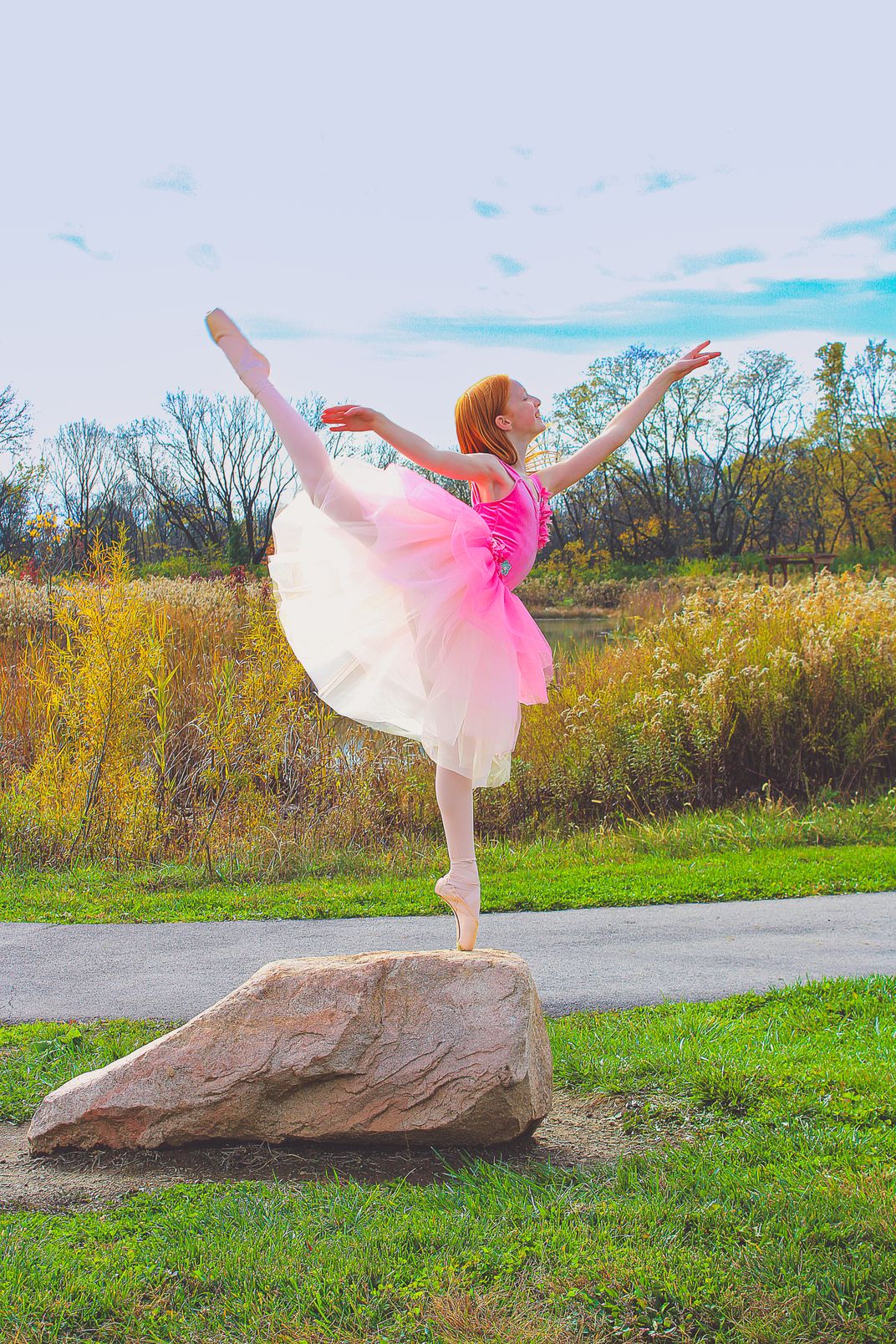 This photograph is showing a ballet dancer doing a Arabesque on a rock.
