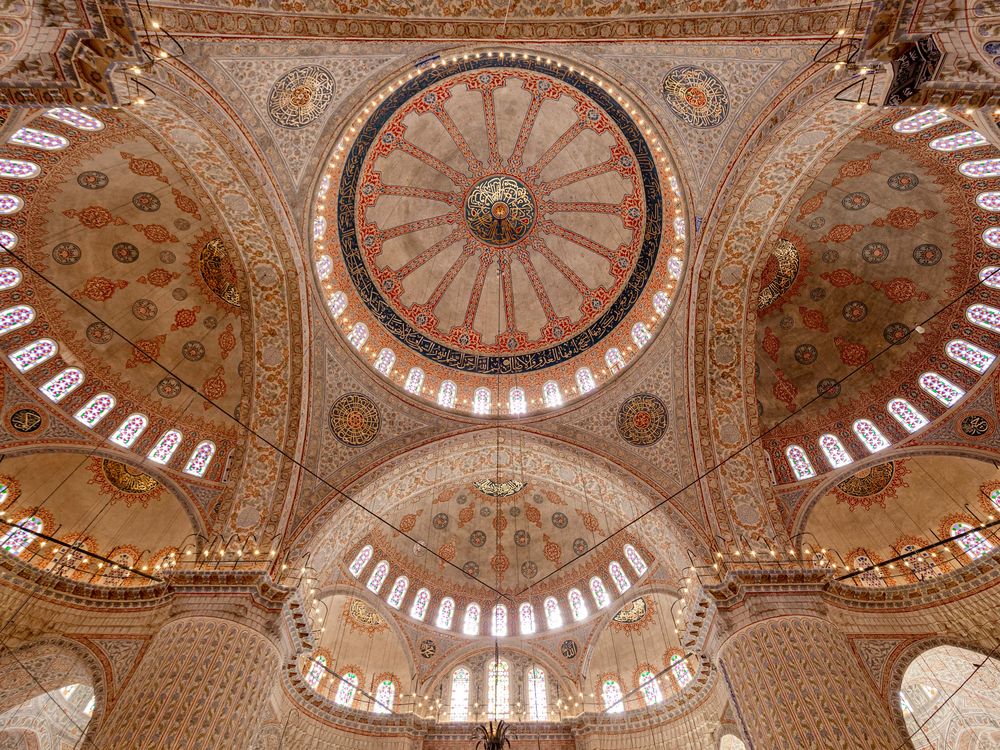 From the ground, the dome ascends like a celestial map. Light fractures through stained glass, illuminating intricate muqarnas and calligraphy on the mezzanine. This shot captures the overwhelming dialogue of two faiths and millennia of artistry, converging in a single, breathtaking architectural cosmology.