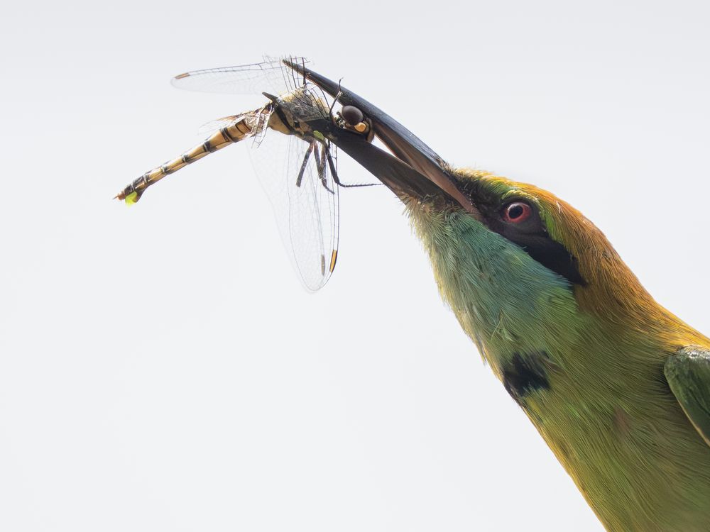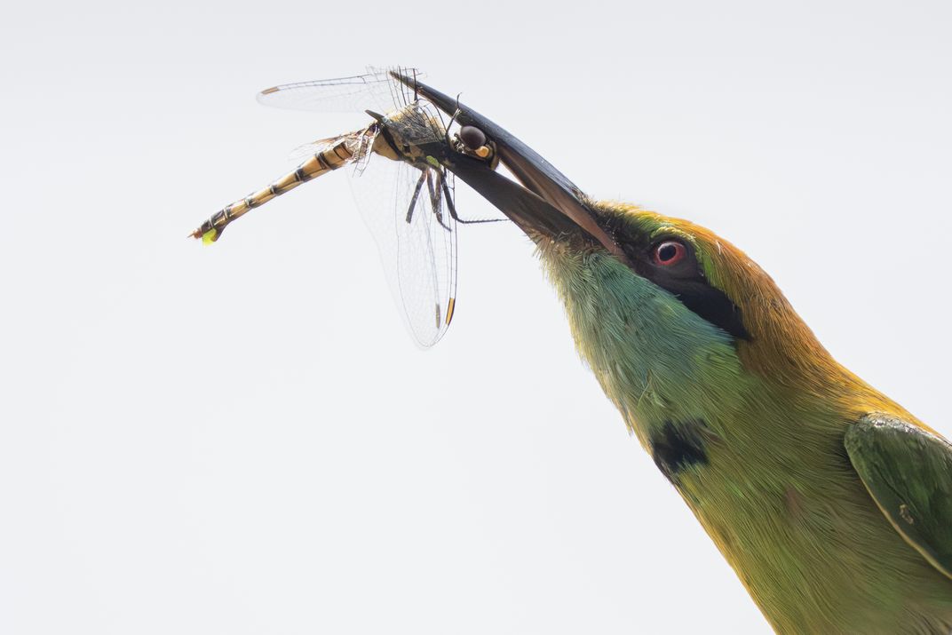 An Asian Green Bee-eater grips a dragonfly, the insect’s broken upper wing visible as the bird subdues it. Vivid green and chestnut tones contrast with the soft background, highlighting the precision and intensity of this hunting moment.
