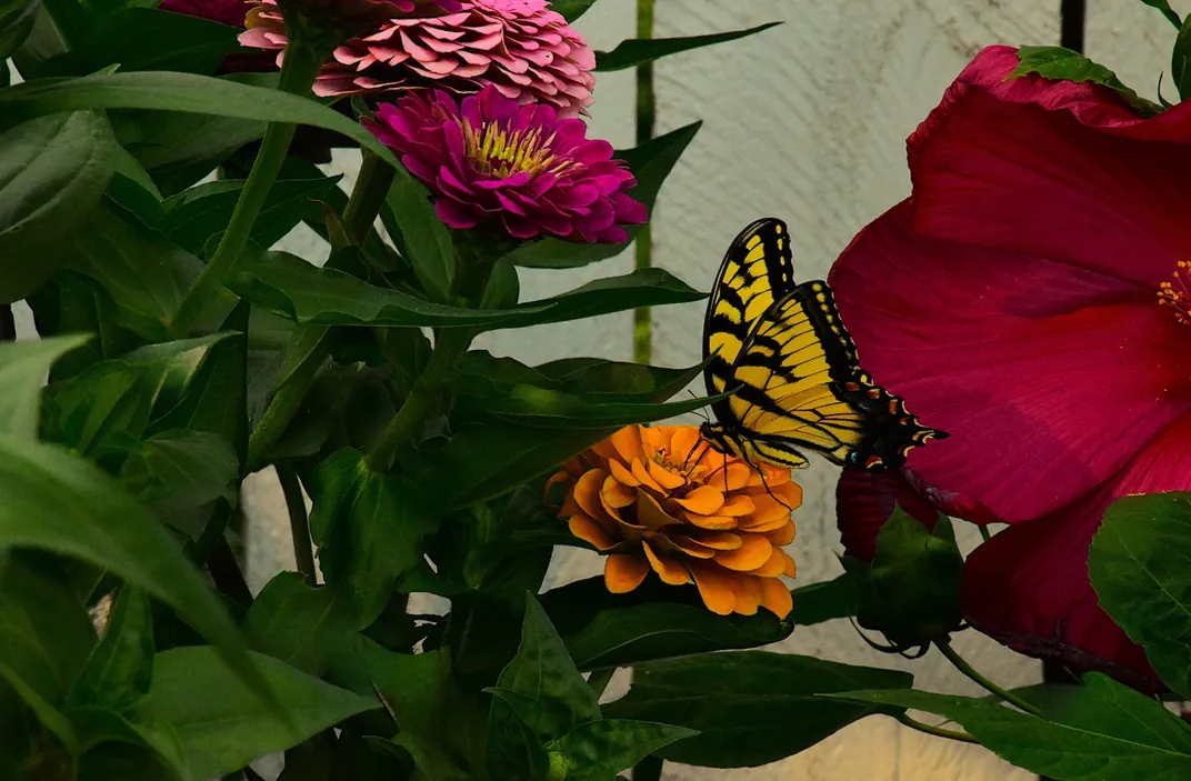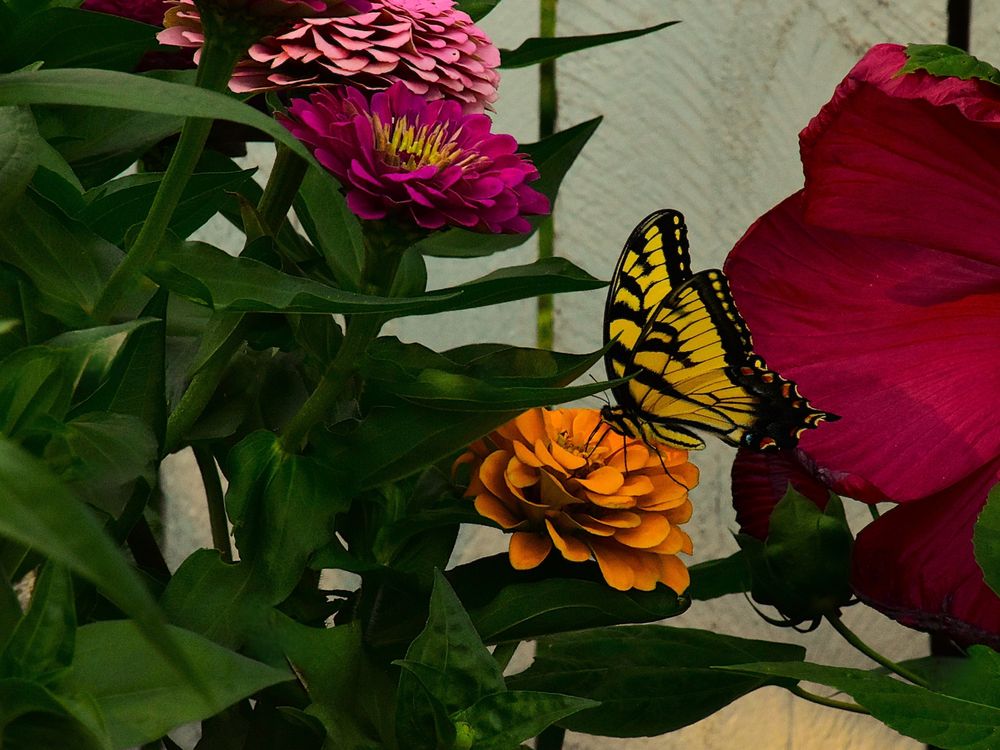 An Eastern Tiger Swallowtail among my zinnias.