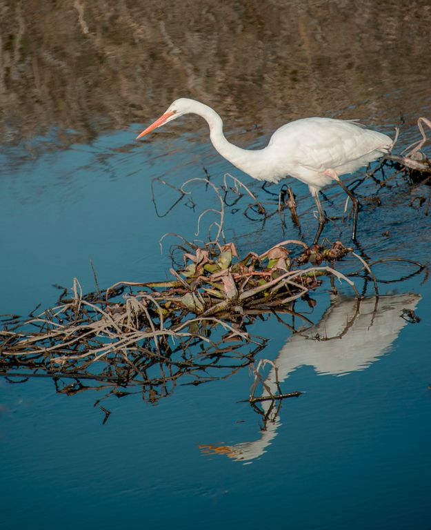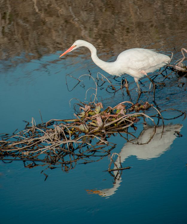 An egret is reflected in pool waters as it fishes.