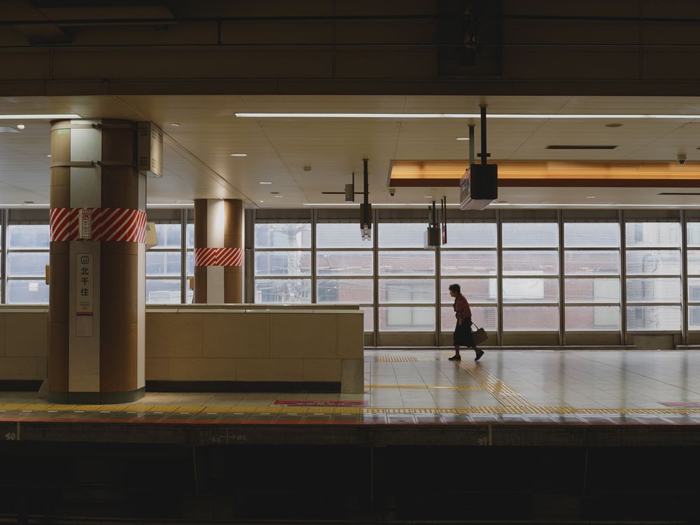 The photo is showing an elderly woman walking from the train towards the stairs in Nishi-Nippori, Tokyo.