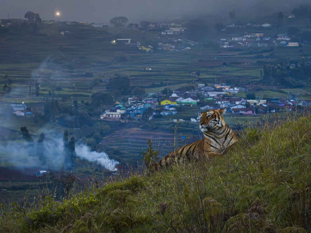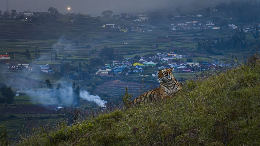 A tiger, sitting on as slope at the edge of a forest, with a village settling into the evening, people returning home, the home lights turning on. But this is also part of the tigers habitat and is looking very relaxed.