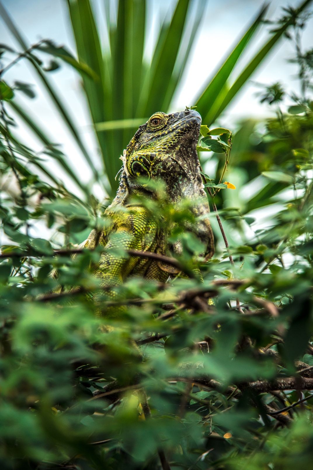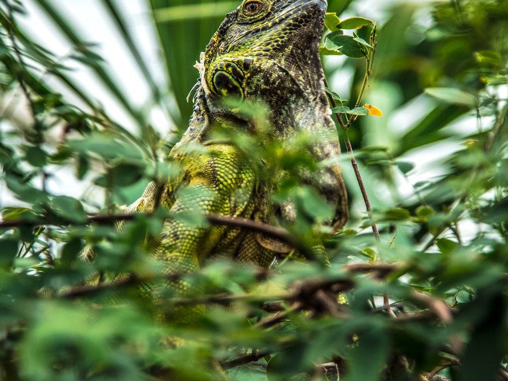 A green Iguana hides amongst the foliage, hidden and watching from high above the ground.