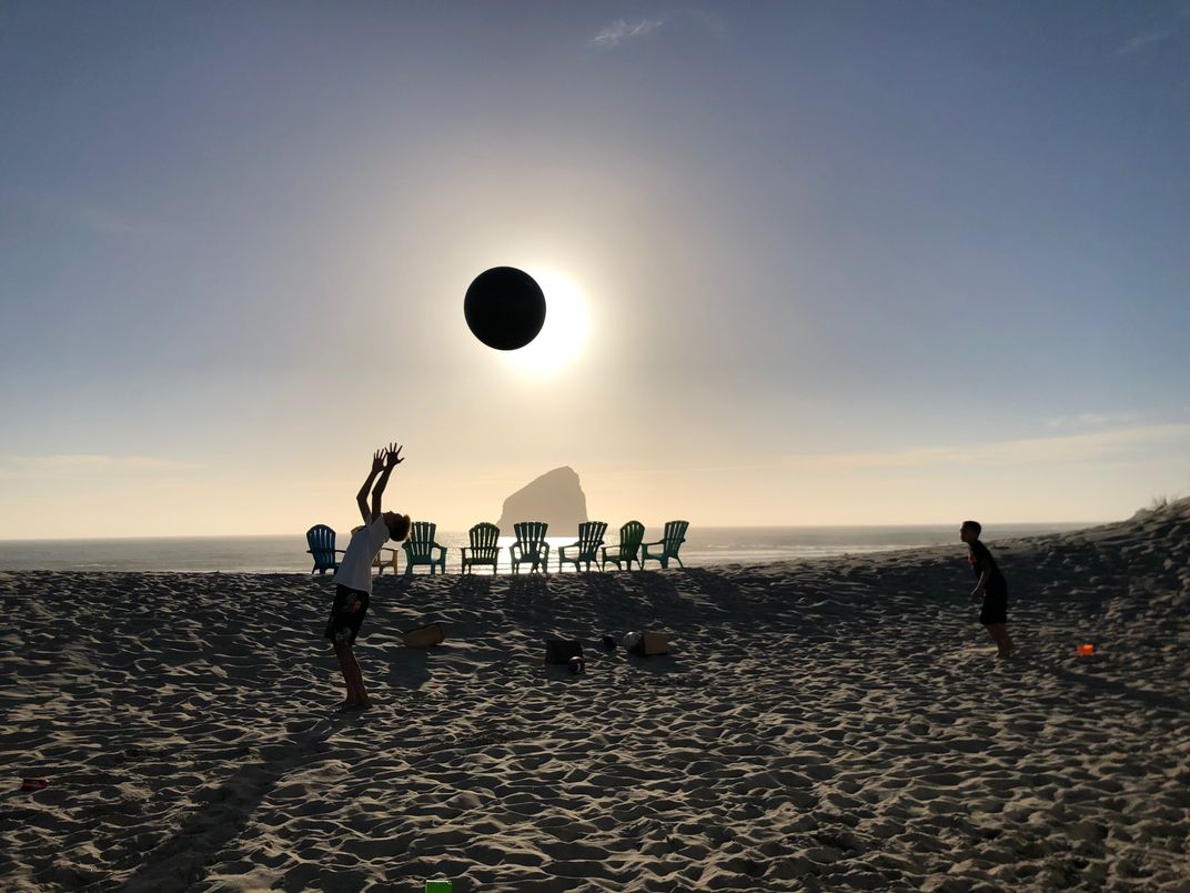 A summer vacation to the Oregon Coast in a town called Pacific City. Two cousins playing catch with a Yoga excersize Ball. The ball was thrown up in the air at the perfect time this photo was taken given the illusion of an eclipse.