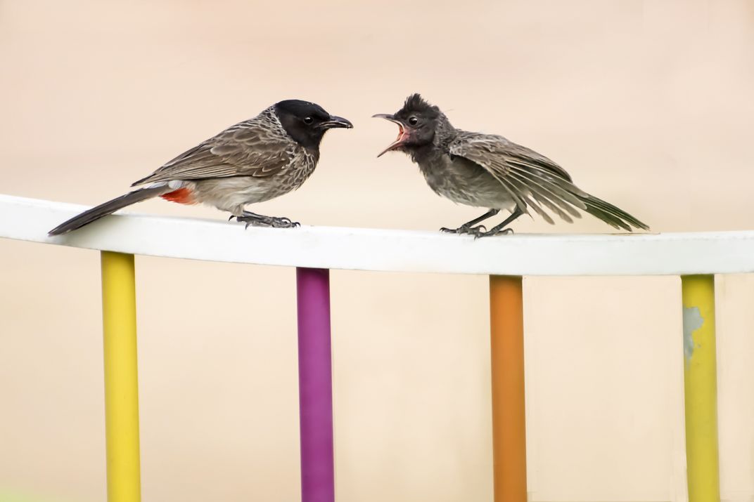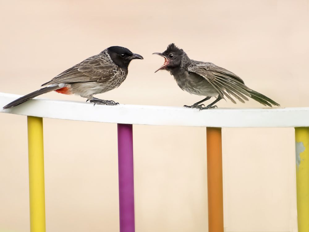 An immature Red Vented Bulbul demanding food from its parent