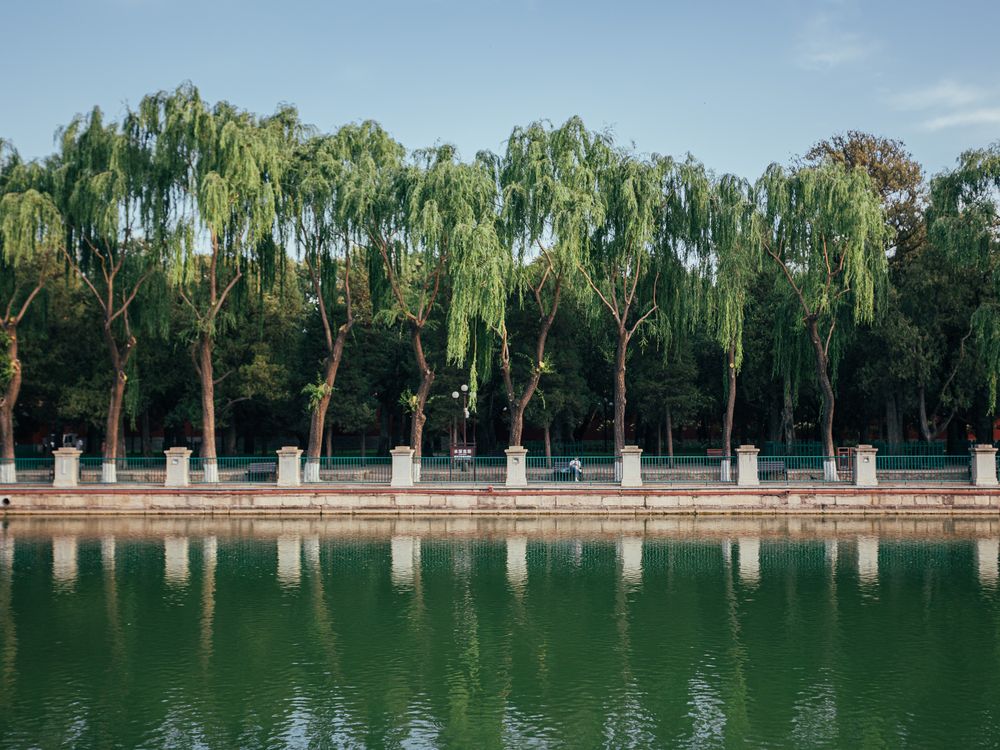 In this minimalist composition, the Forbidden City reveals its true scale not by its palaces, but by its ancient trees. A lone figure, seated on a bench, becomes the essential unit of measurement, revealing the monumental height of the canopy and the profound serenity of a timeless realm.