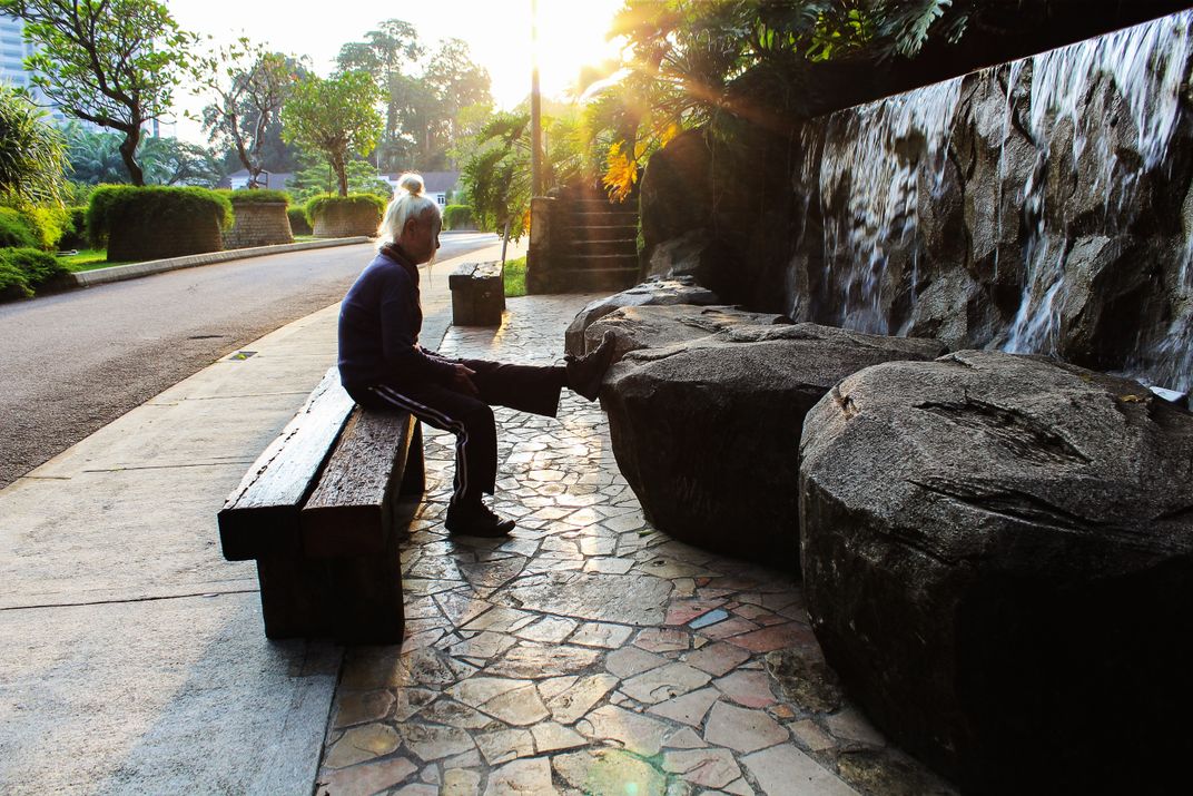 an old lady trying to do some exercise and relaxing by the waterfall. She's enjoying the view and so calming