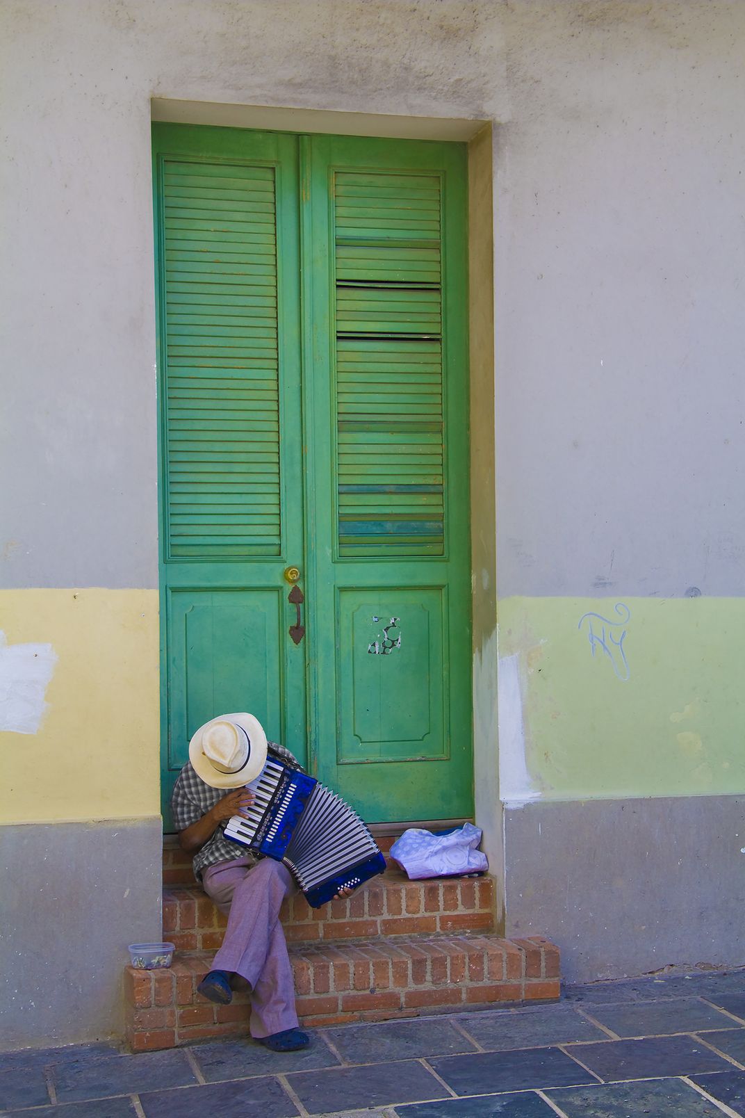 An old man playing the accordion on a doorway.