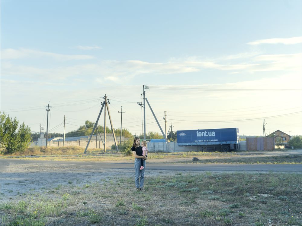 Ukraine, Kharkiv, september 2024. When i saw this place it immediately made me think of an american scenery. Right away i imagined taking a picture of someone with a child at this place. so i waited... until Anastasia and her daughter came a few hours later. i wanted people to think about what it is to be a mother, to be a child in a city like Kharkiv where you get multiple bombings and alerts everyday and the front line just kilometers away.